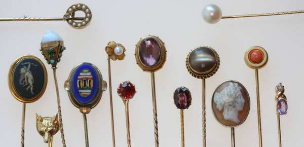 A collection of various gold tie pins