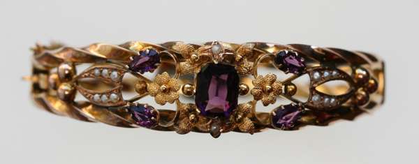 A 9ct gold Edwardian amethyst and pearl set hinged bangle