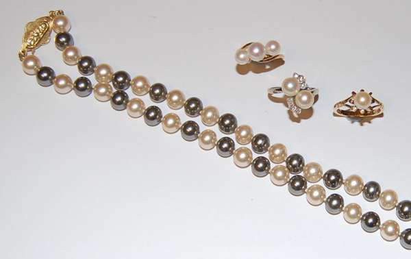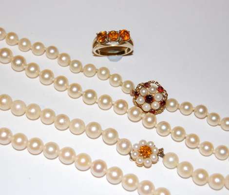 A cultured pearl necklace with citrine set clasp and a matching three-stone ring