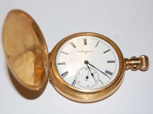 A keyless wind full hunter cased rolled gold pocket watch by Elgin