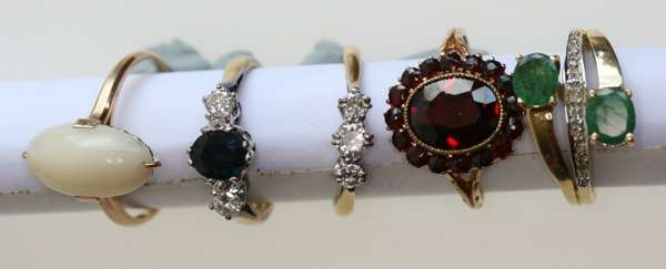 A group of five diamond and other rings