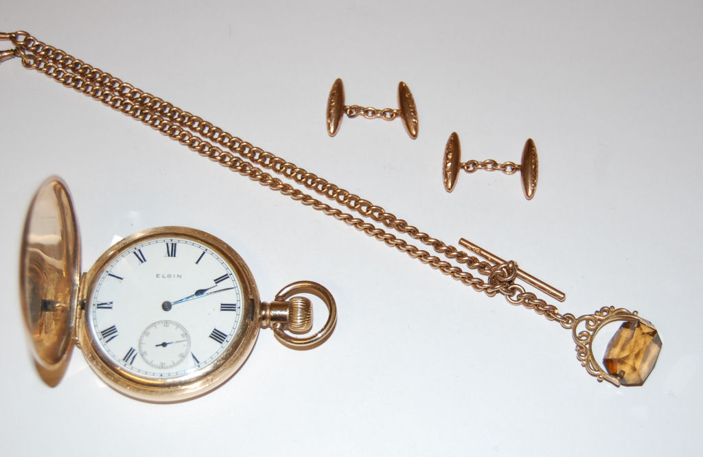 A keyless wind full hunter cased rolled gold pocket watch by Elgin