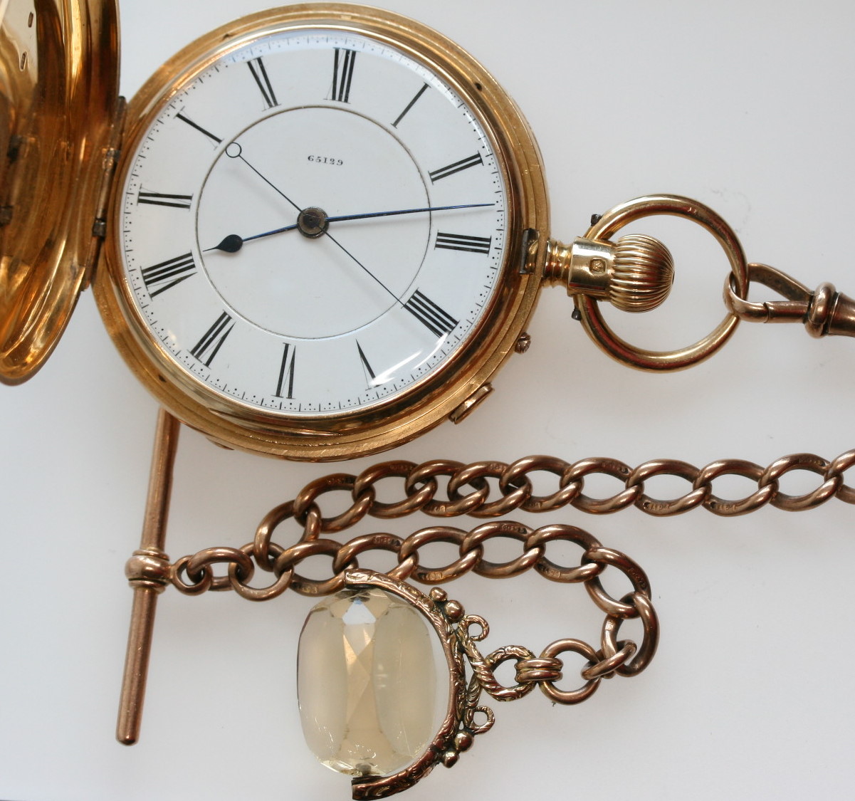 the movement signed Tho Russell London, three quarter plate and with stop start button, plain full hunting case with engraved monogram, white dial numbered 65129 as is the movement, the Albert of open curb links with swivel citrine fob