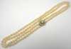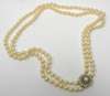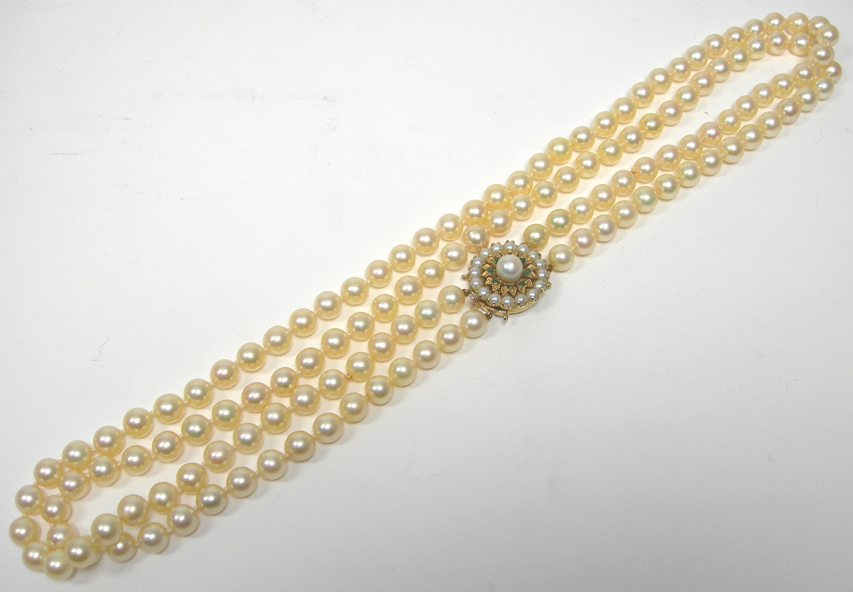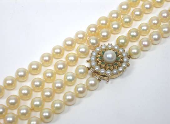 A cultured pearl necklace with emerald set clasp