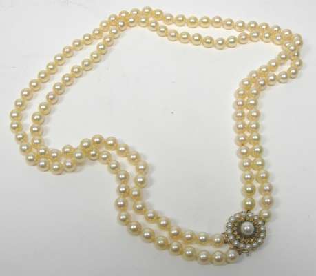 the necklace composed of two rows of uniform pearls, measuring approximately 7.5mm diameter, with 9ct gold circular clasp, set with a large cultured pearl within borders of circular cut emeralds and half-pearls