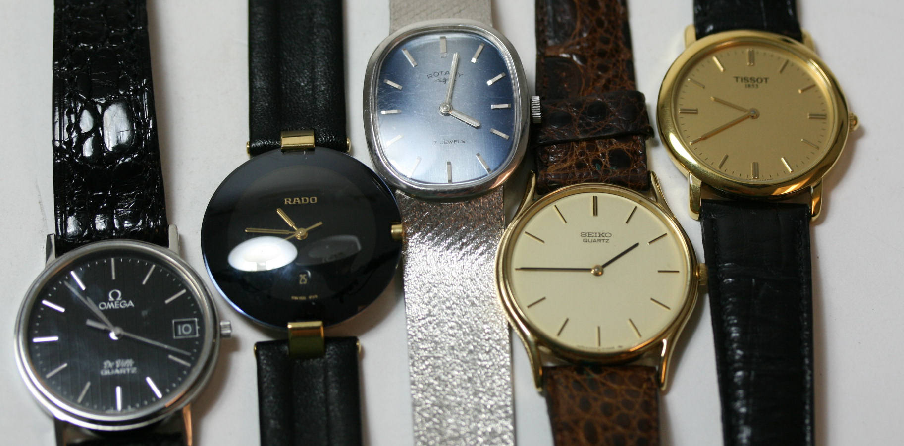 all cased or with pochettes, makes include; Rado, sweep second hand and date; Seiko; Tissot; Omega de Ville, sweep second hand and date; Rossini; and a 1980's Rotary dress wrist watch, blue dial, silver case and flexible silver textured bracelet