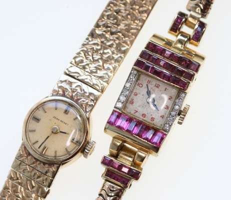 the square dial with red numerals, the scroll case set with stepped rows of calibre cut rubies and eight cut diamonds to the bezel, gold flexible bracelet; together with a 9ct gold ladys wrist watch, gold case and flexible bracelet, the dial inscribed Jean Renet