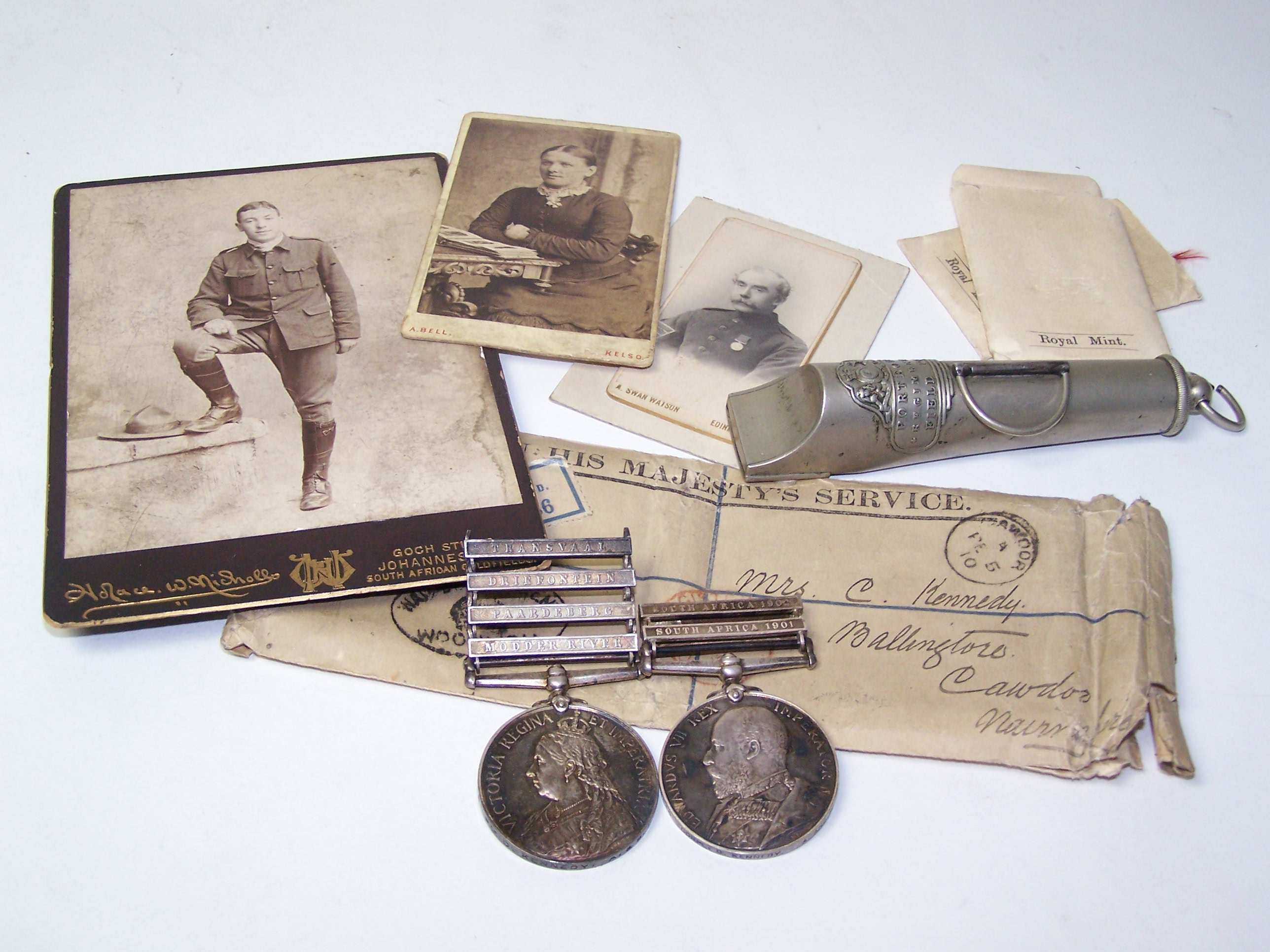 to 4546 Pte D KENNEDY A&S Highrs, QSA with TRANSVAAL, DRIEFONTEIN, PAARDEBERG and MODDER RIVER bars and with ghost dating to reverse, KSA with South Africa 1901 and 1902 bars, both in original Royal Mint envelopes and with postage envelope etc; together with original family photographs and a white metal 'Porteous Regimental Field Pipe' (qty)