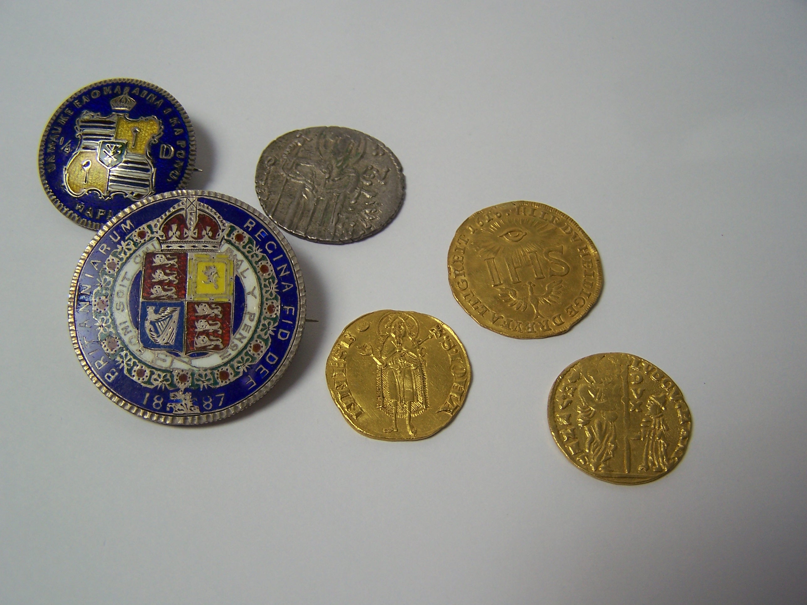 1187-1530AD, St John to obverse, Lily to reverse; Germany; Saxony, one Ducat Sophia Saxony 1616; another hammered gold coin; a hammered silver Asper of Manuel I, 1238-1263; an 1887 enamelled florin, brooch fittings; an enamelled continental coin, brooch fittings (6)