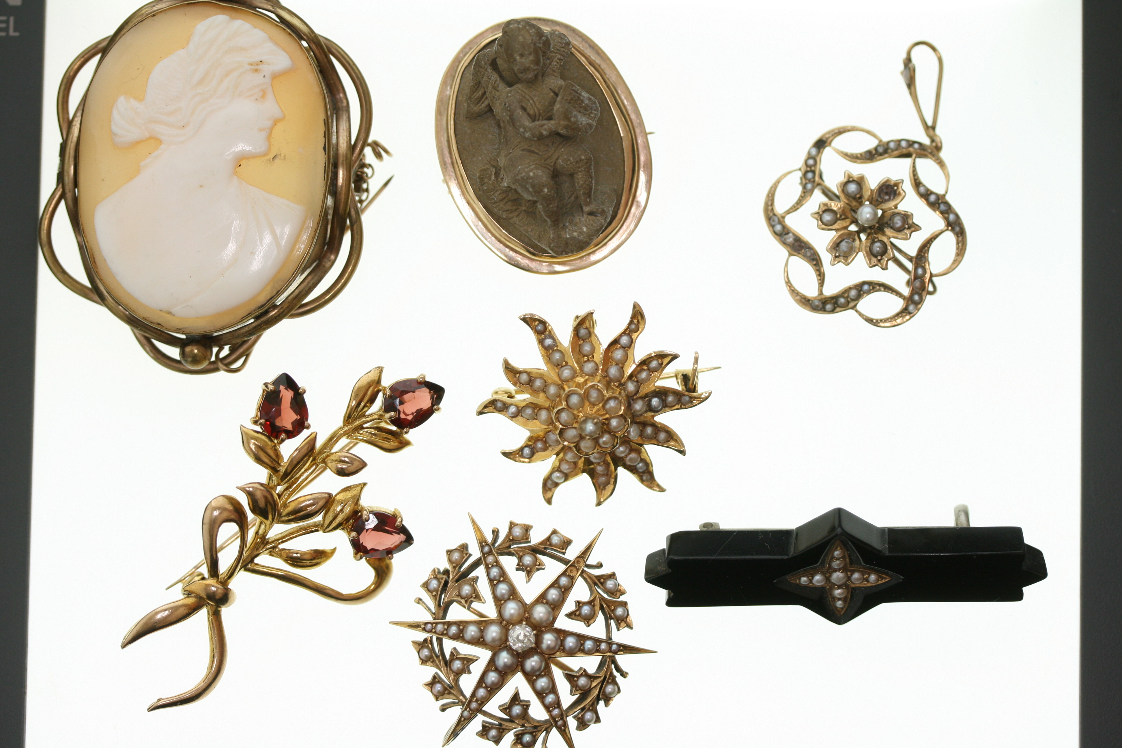 together with two other pearl set brooches; a shell cameo brooch; a lava brooch; a modern garnet set floral spray brooch