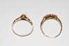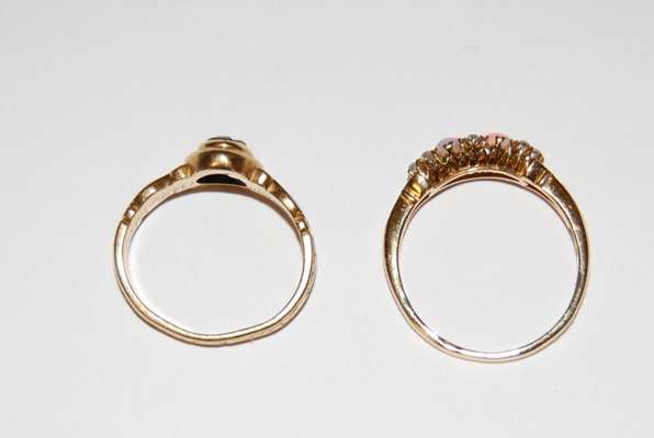 claw set with two cabochon opals with old brilliant cut diamonds between and to shoulders, shank marked 18ct; together with Victorian memorial ring, the heart shaped head with engraved borders nd centrally set with cameo of a forget me knot, the shoulders with black enamel with gold scroll detail, the inside of the shank with 18ct hallmarks and engraved 'Eliza Stuart Burn, Obt Decr 18th 1858' (2)