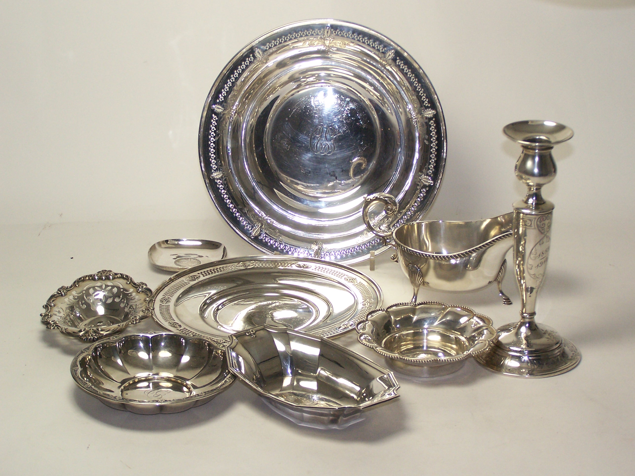 to include a candle stick marked STERLING and indistinct maker's mark; three bowls of pierced and embossed designs marked STERLING only, a bon bon dish by WALLACE; a plate with pierced border by JE Cauldwell & Co and a pin dish by Gorham; together with a modern sauce boat and coin set pin tray (qty)