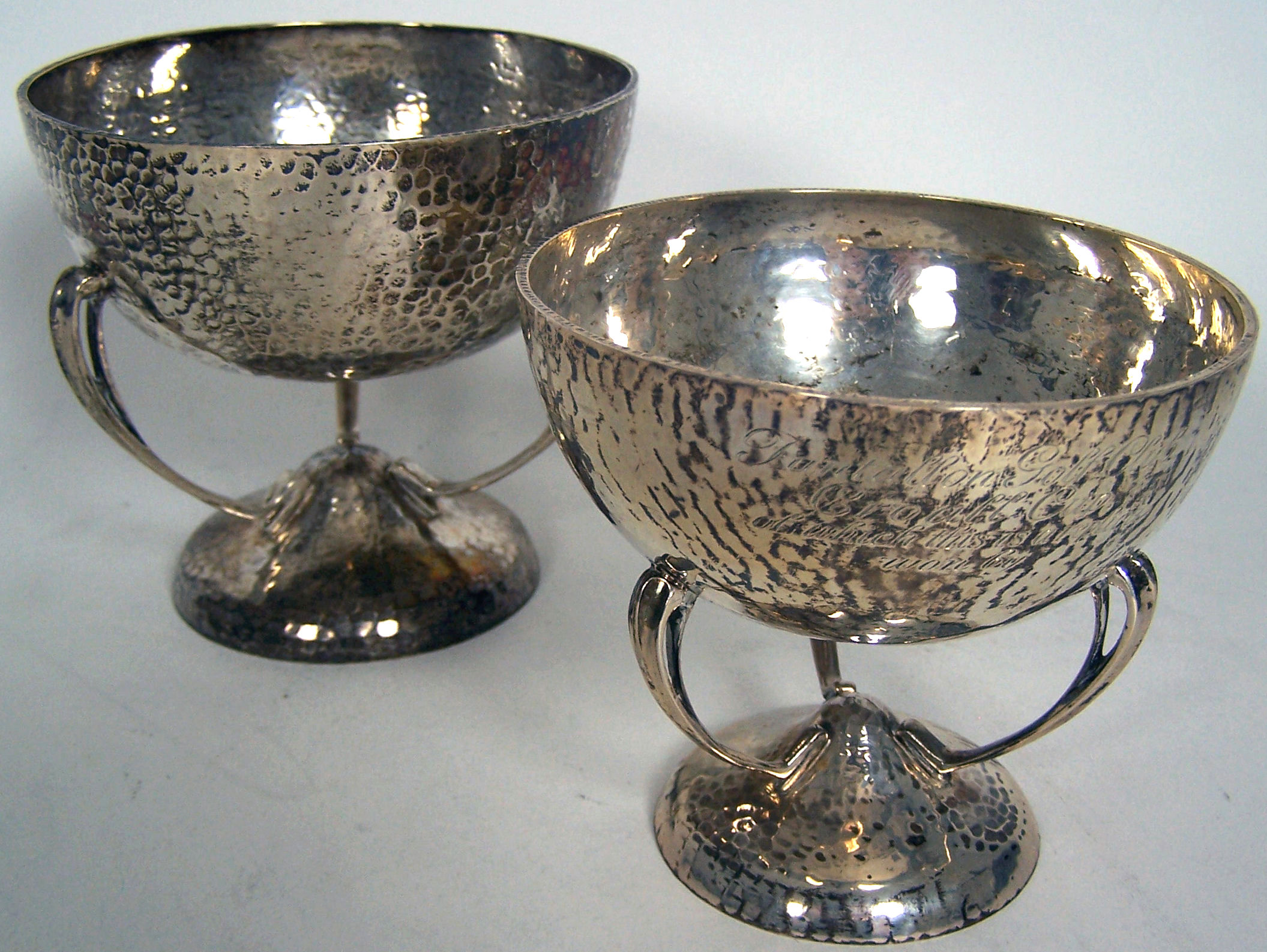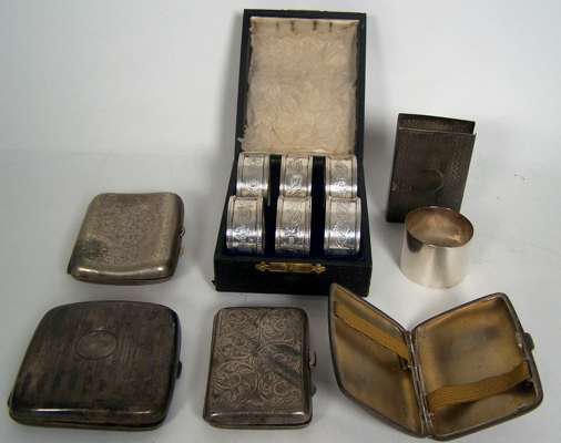 of conventional form with engraved decoration, a match box cover with liner engraving and a cased set of six napkin rings (6)