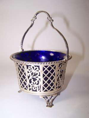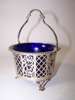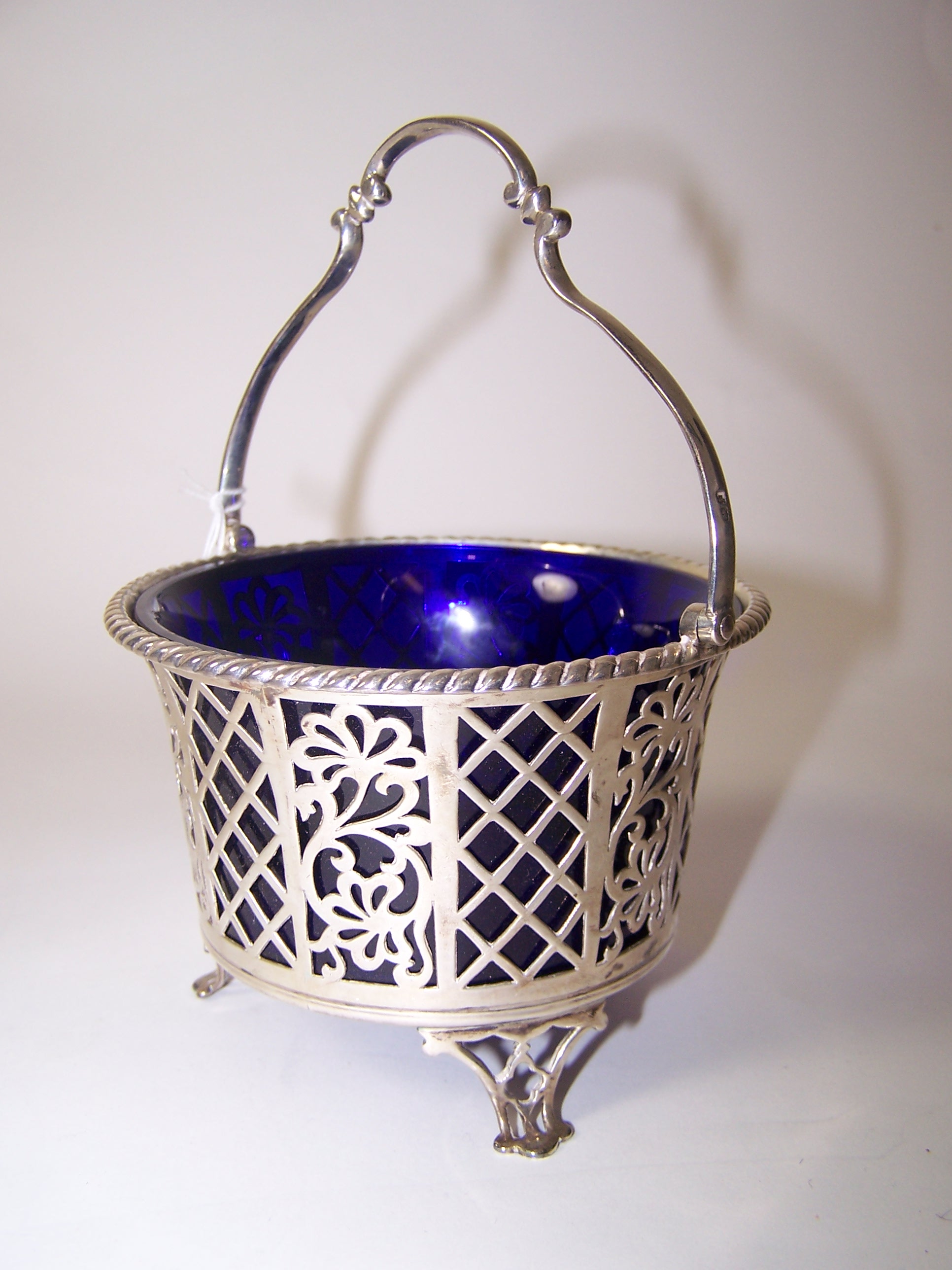 by Hukin & Heath, Birmingham 1937, the body with lattice work decoration showing blue glass liner, raised on four pierced bracket feet and with simple scroll formed swing handle; together a group of condiments including a pair of spherical pepperettes with all over Indian chased designs (qty)