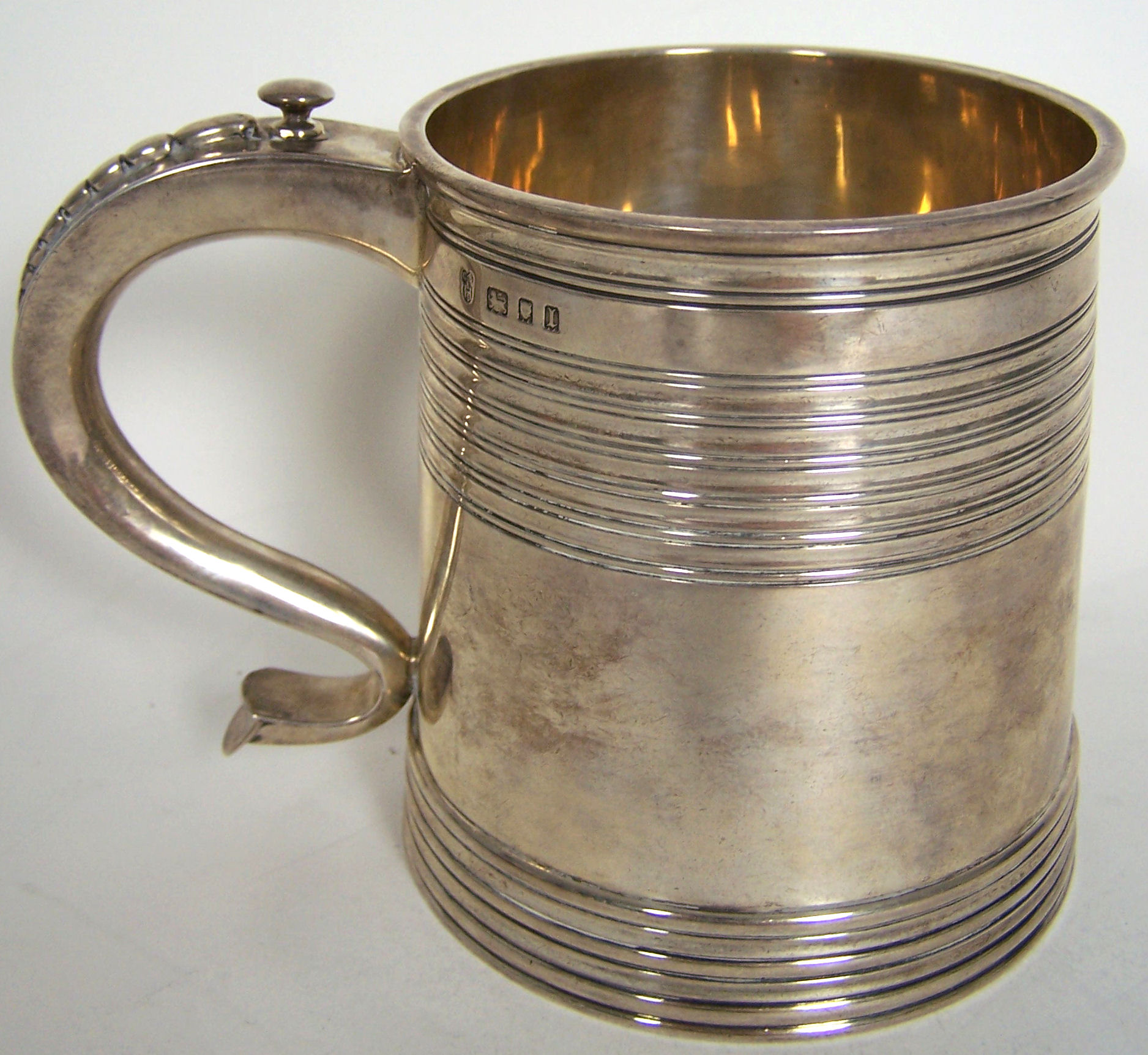 C S Harris & Sons, London 1906, of slightly flared form with two bands of reeded decoration, the well formed S scroll handle with beaded detail