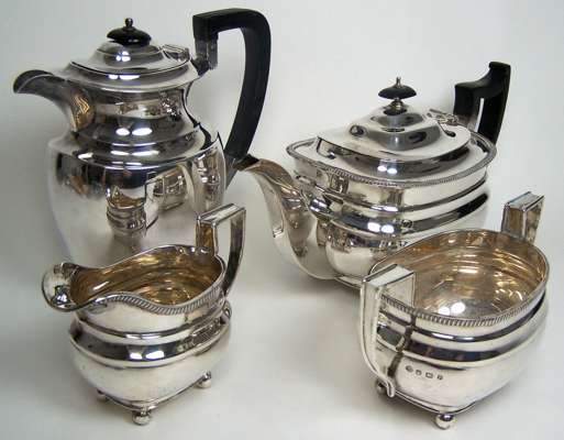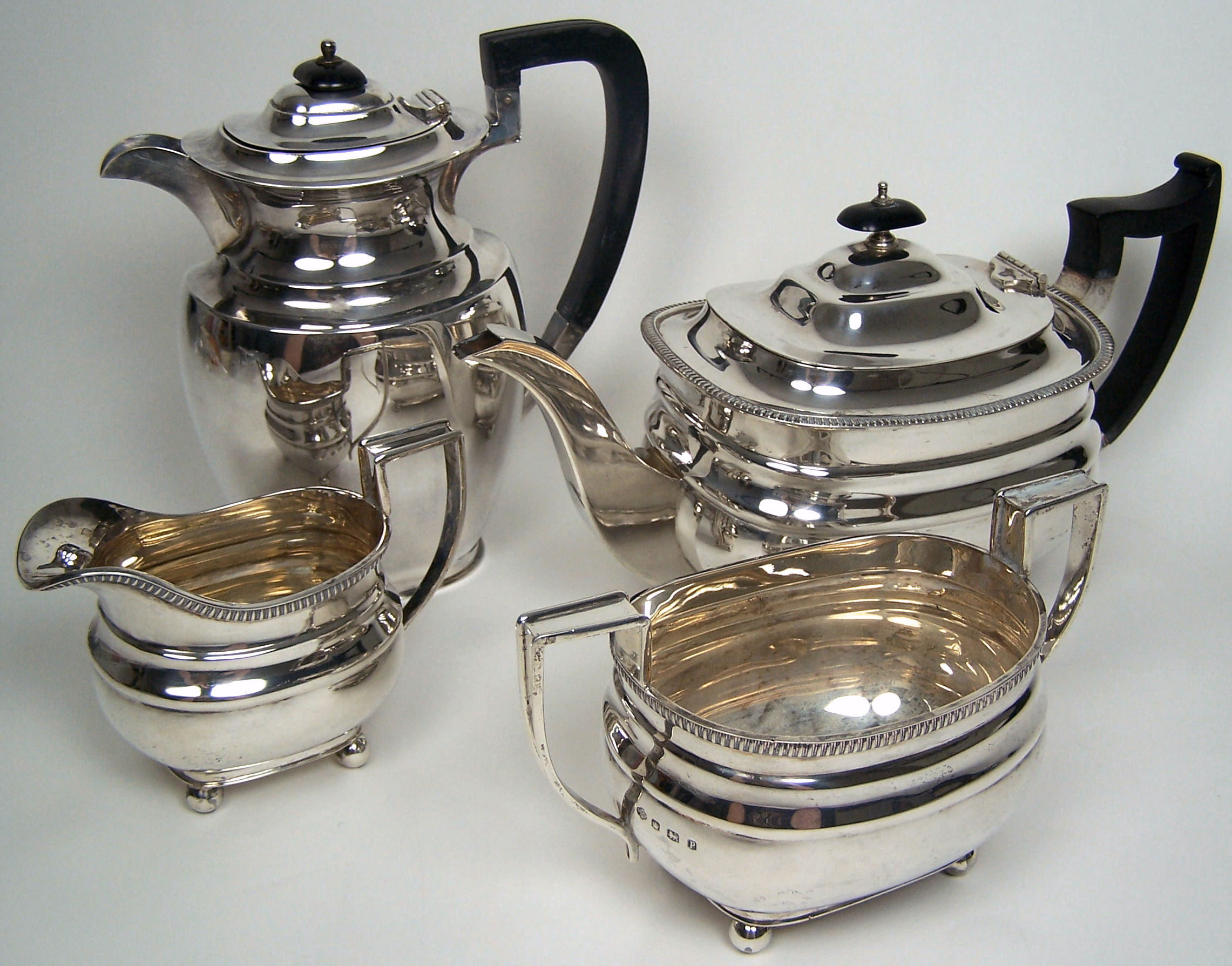 various dates and makers, comprising water pot, teapot, milk jug and twin handled sugar bowl, each of simple plain bellied form with everted reeded border (4)