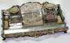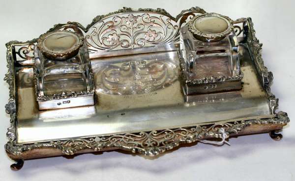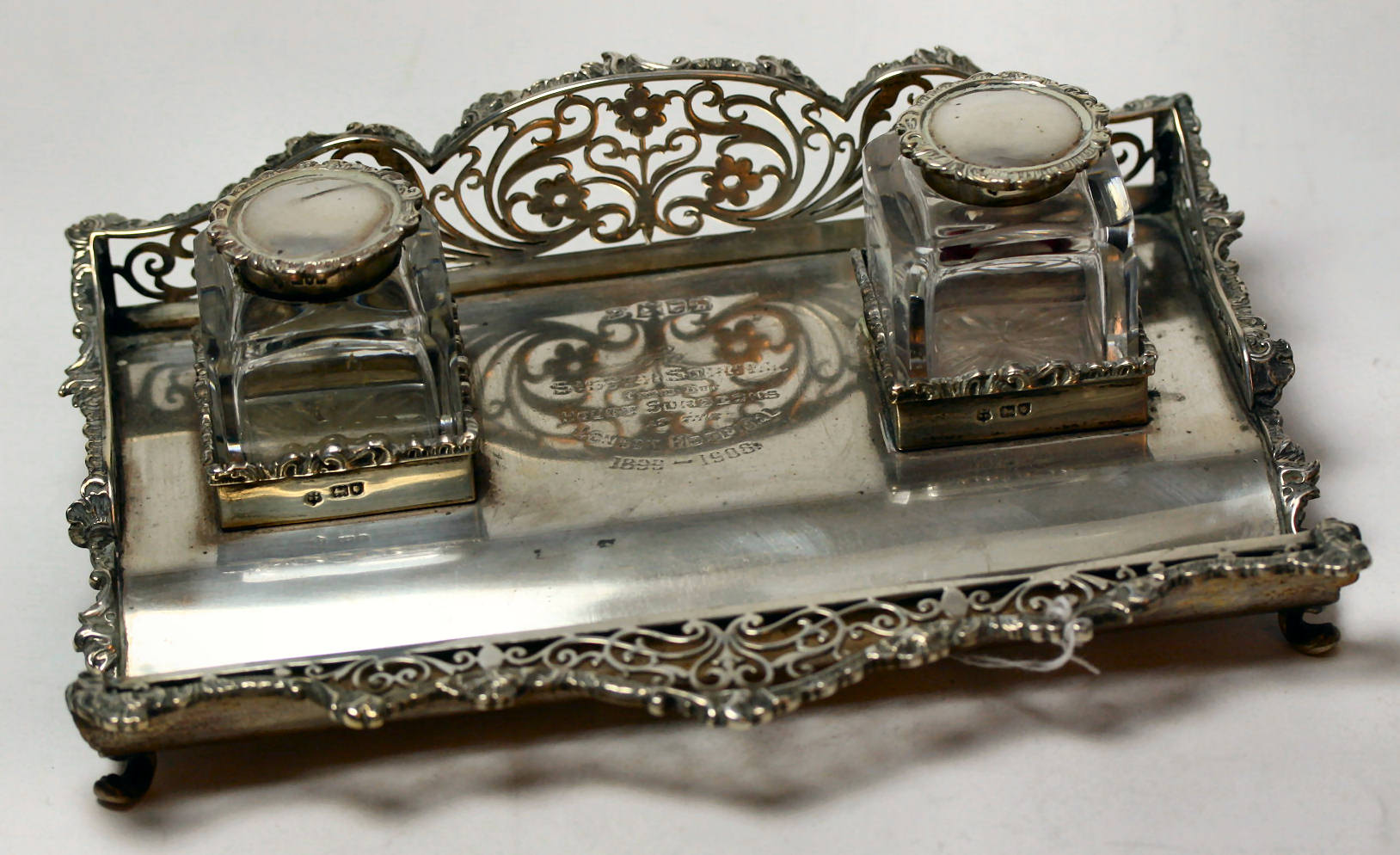 London 1903. the rectangular plates with deep concave pen tray, the whole with pierced and moulded rim gallery, also set with two glass ink bottles