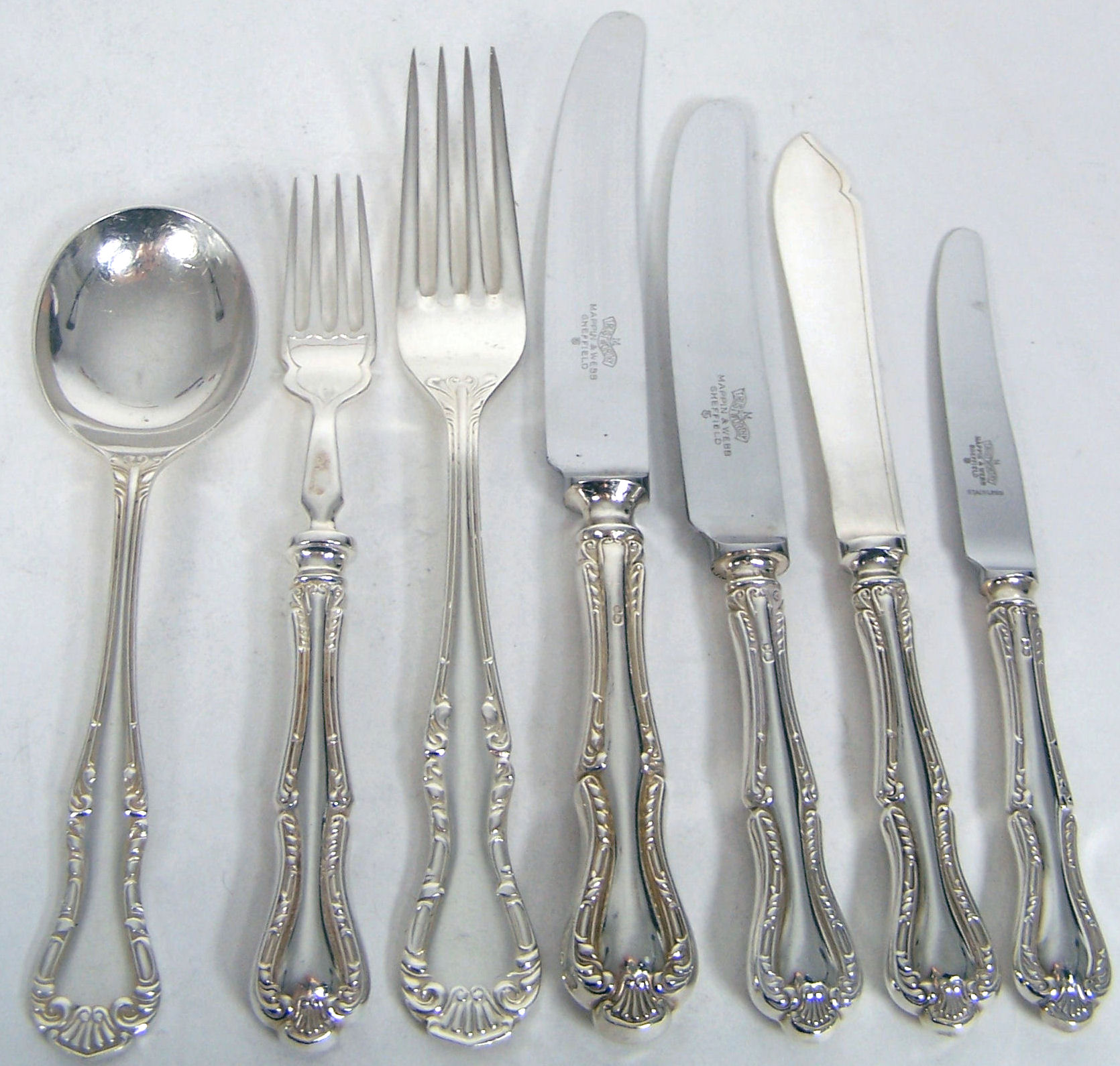 Mappin & Webb, Sheffield 1978, of hourglass variant with foliate detail, comprising fish knives and forks, table forks, soup spoons, table and side knives (with steel blades) (75)