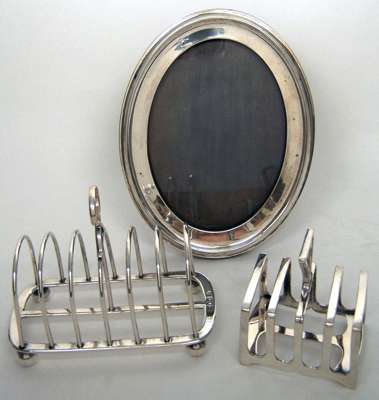 Goldsmiths & Silversmiths Company, London1908; together with a silver plated toastrack and an oval photograph frame Birmingham 1942 (3)