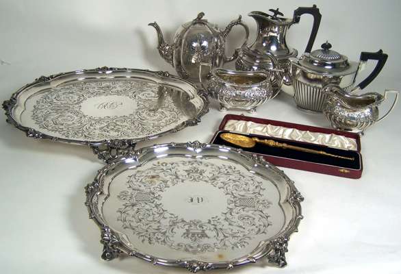 unmarked, of typical form with chased decoration, contained in a fitted case with presentation plaque to cover; a twin handled sugar bowl and milk jug Sheffield 1898, with baluster bodies, embossed fluted and scroll designs; together with various plated teapots and salvers (qty)