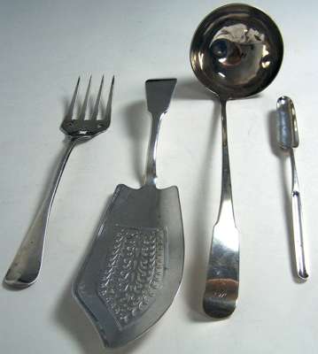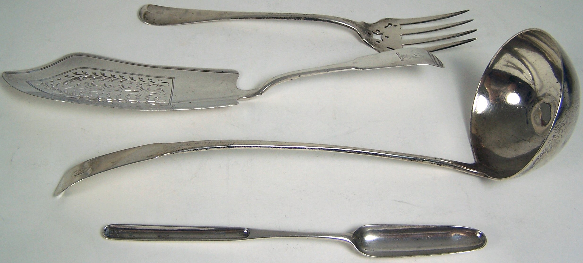 to include an Oar pattern soup ladle Edinburgh 1802; a Victorian serving fork, Hanoverian pattern, P Sutherland, Edinburgh 1846; a George III fish slice, London 1816, Fiddle pattern with scroll pierced blade, and a George III marrow scoop, London 1794 (4)