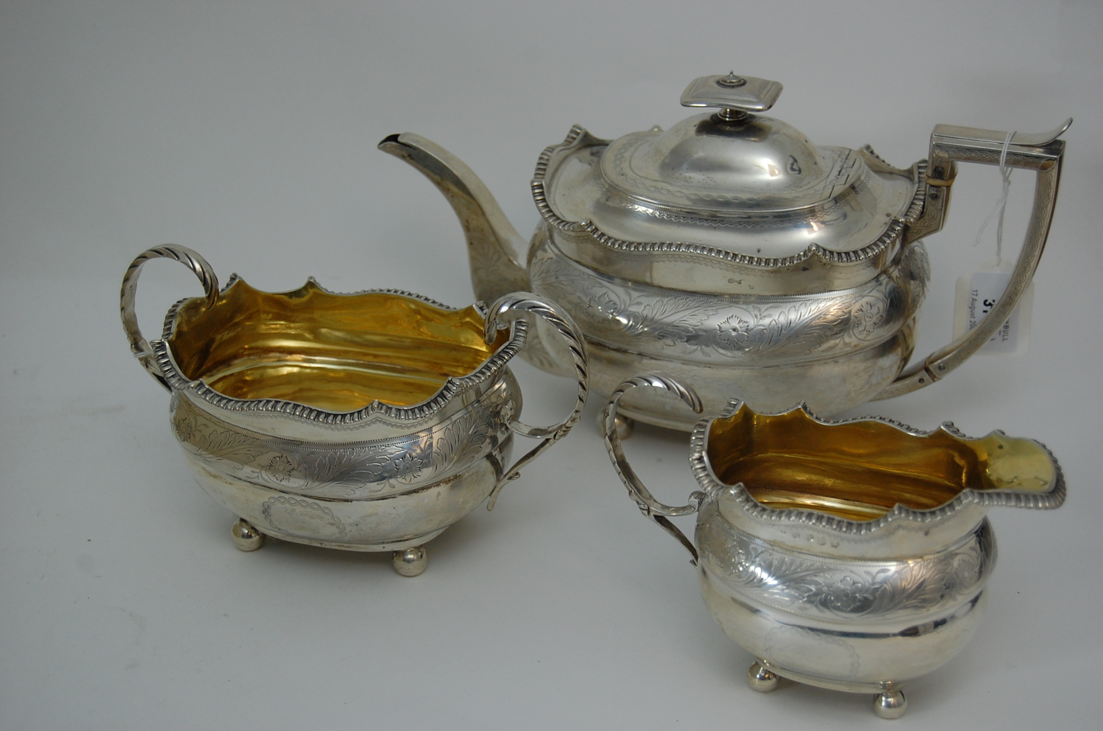 George Fenwick, Edinburgh 1811, of rounded rectangular form, wavy gadroon rim, lower band of bright cut engraved flower heads and leaves, lower blank cartouche, all on ball feet, leaf clasped scroll handles to the milk jug and sugar bowl, the teapot with an engraved angular handle, the spout with floral engraving