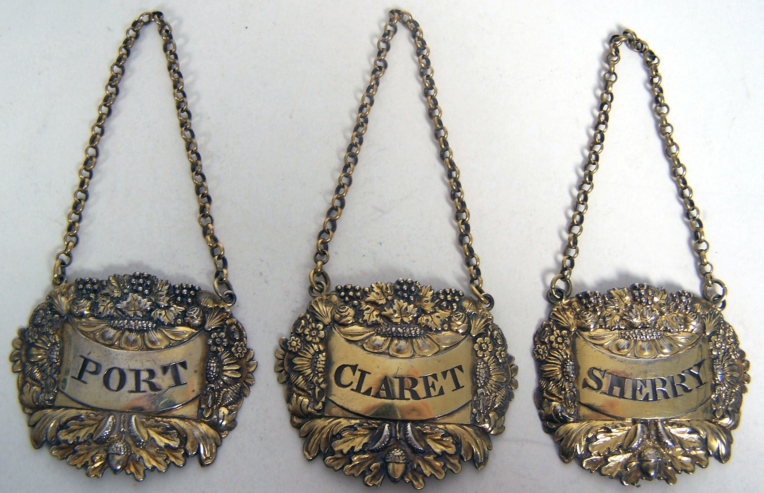 A set of three George III silver gilt wine labels