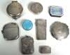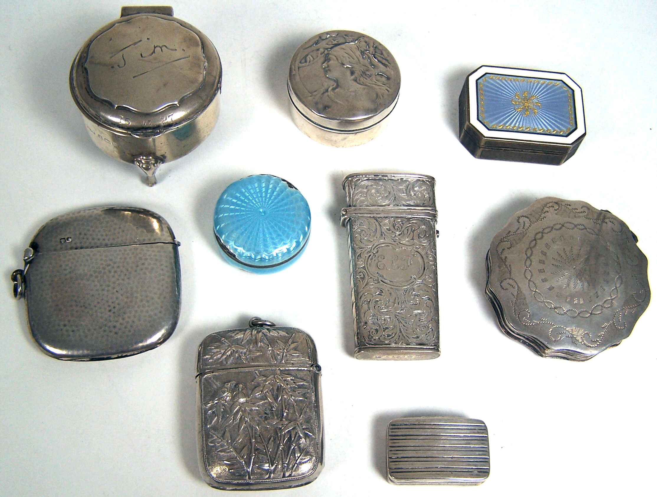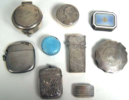 to include a Chinese export vesta case, with embossed bamboo and blossom decoration; a Victorian lancet case by N Mills, with all over engraved foliate decorations (lancets lacking); a Continental enamelled pill box with white border and light blue panel; together with various other small boxes (9)