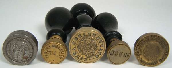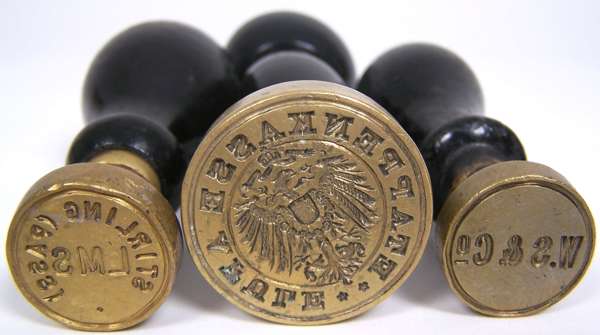 three with painted handles, brass, engraved with LMS Stirling (Pass); WS & Co.; another with a Germanic eagle and inscription 'Etapenkasse Afule'; and a German Postal Stamp; a steel seal with Glasgow Coat of Arms and motto (5)