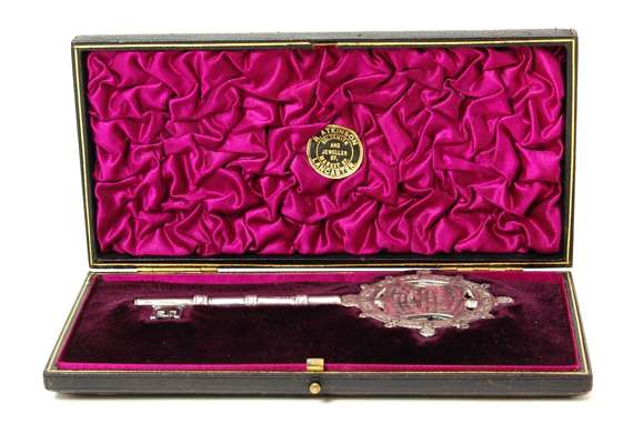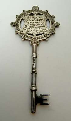 Notes: the key head engraved "Presented to Dr Copeland FRSE Astronomer Royal for Scotland by Mr Councillor Molyneux at the opening of Greg Observatory Lancaster 27th July 1892"