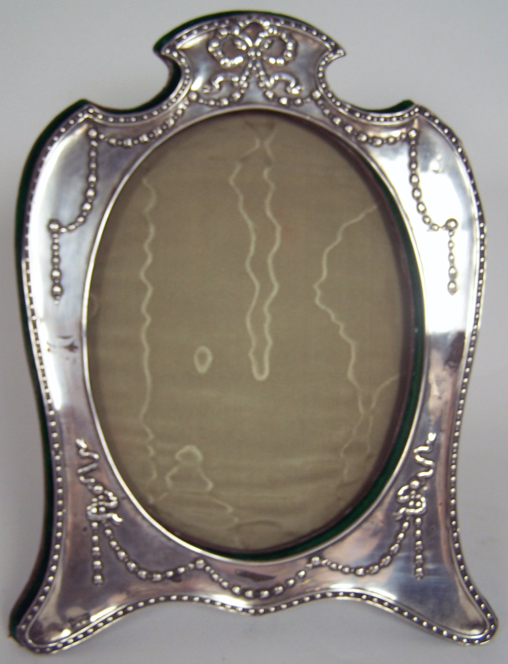 Chester 1905, of shaped shield outline with beaded edge and bow and garland design, with oval glazed section, on green felt backing and easel support