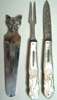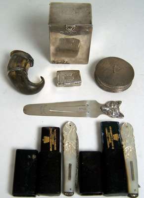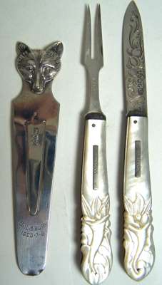 retailed by Goldsmiths Company Sheffield 1888 and 1892, with carved mother of pearl handles and silver blade with engraved trailing fruit decoration, and with simple two pronged fork, in original leather cases; together with a playing card box London 1898; a novelty bookmark with a foxes mask terminal, Chester 1907; a vinaigrette by Samuel Pemberton Birmingham 1817 and a small snuff mull (A/F) and a patch box (7)