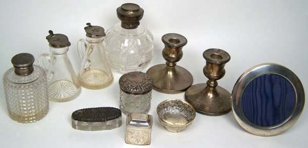 the cut glass bodies with simple hinged and screw off caps; two whisky noggins of conventional form with simple hinged covers, a small circular photo frame and a pair of dwarf candlesticks (11)