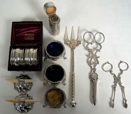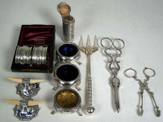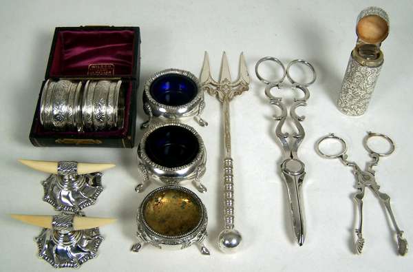 S MORDEN London 1893, the cylindrical bottle with hinged domed cover and all over engraved foliate scroll decoration; together with a group of small silver to include open salts, knife rest with ivory supports, napkin rings etc (qty)