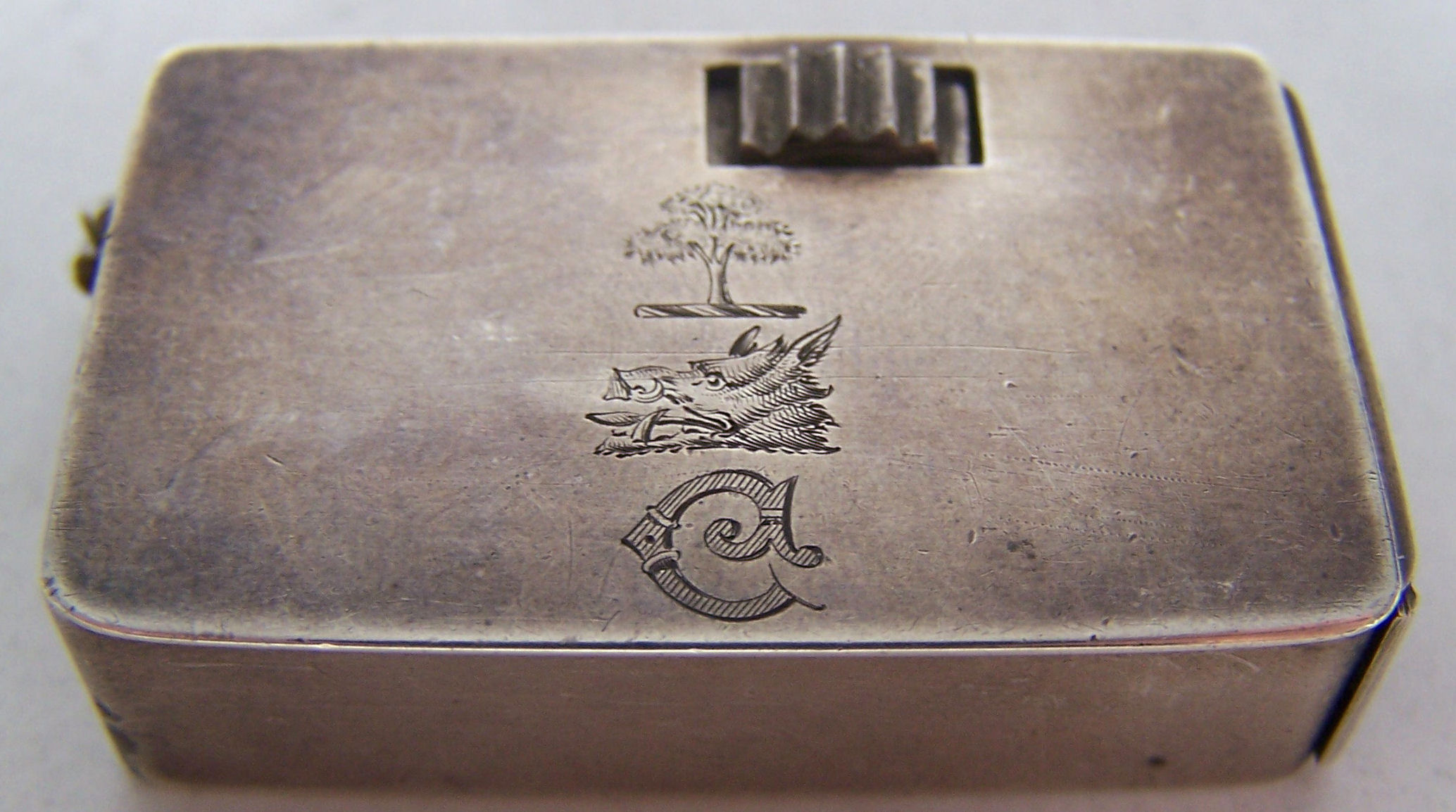 retailed by Upton & Hussey (St James St), London 1853, of simple rectangular outline with two strikers, the hinged cover with thumb screw for advancing the wick, with engraved crests and initial