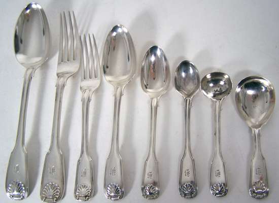 Hayne & Carter, London 1844, of double struck Fiddle, Thread and Shell pattern, comprising six table forks and spoons, seven dessert spoons, six dessert forks, eight teaspoons, eight condiment spoons, two mustard spoons and a caddy spoon (qty)