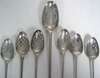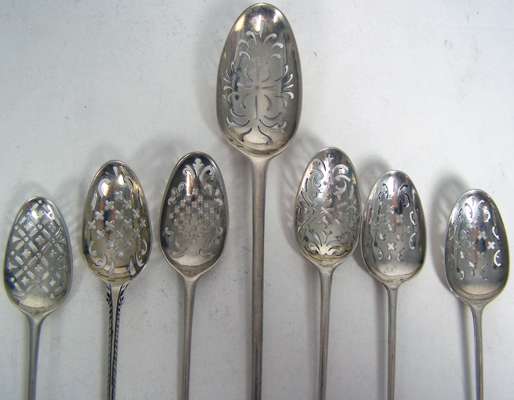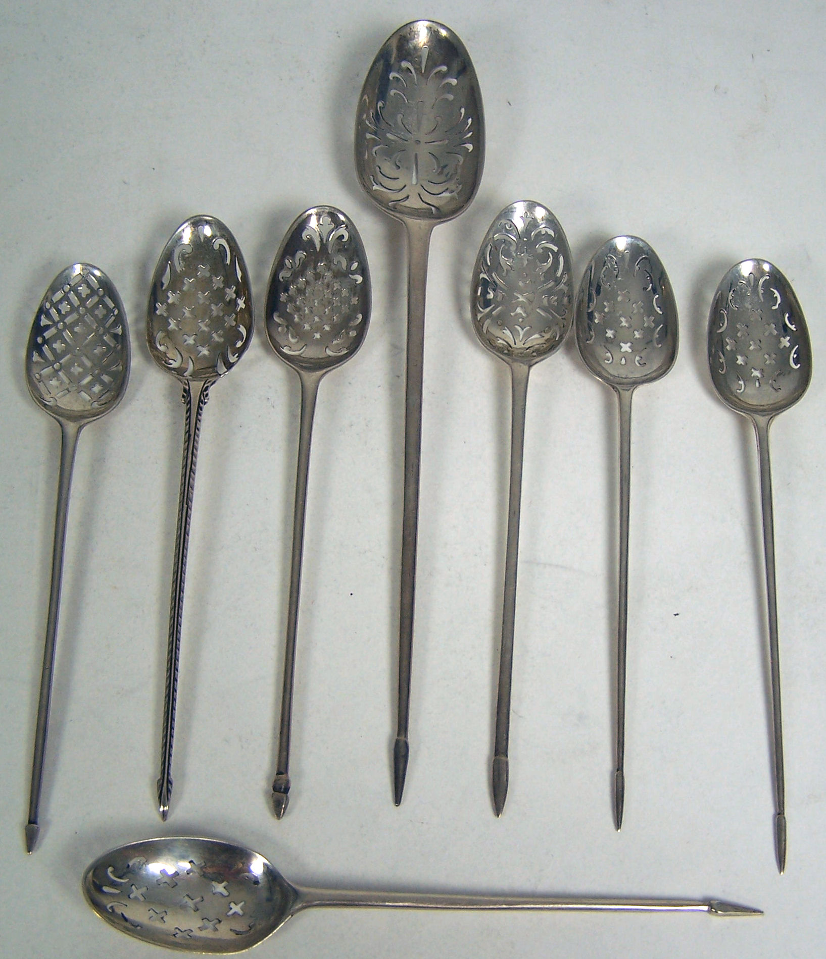 all with London marks circa 1730's - 1740's of conventional form with tapered stems and shaped finial with pierced details to bowls; together with a large example of good gauge and conventional form and another example with feathered edge detail (8)