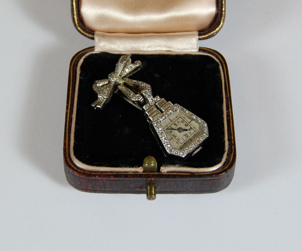 the bow formed brooch with simple pendant drop to shaped diamond faced fob watch, the whole set with round brilliant and baguette cut diamonds