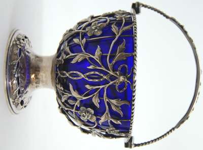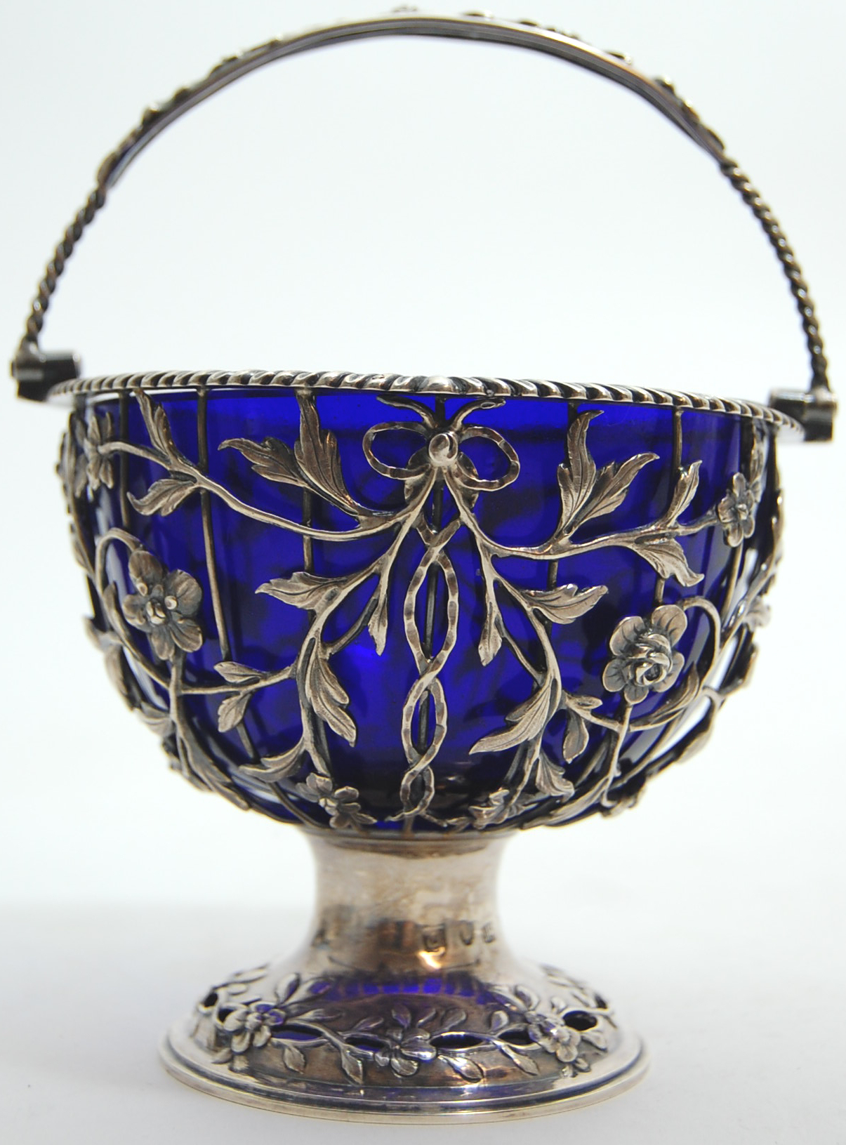 W. V., London 1771, the deep wire work basket with applied floral, foliate and bow designs, with gadrooned border and on simple spreading foot with embossed and pierced detail, the twisted swing handle with floral motifs, with blue glass liner