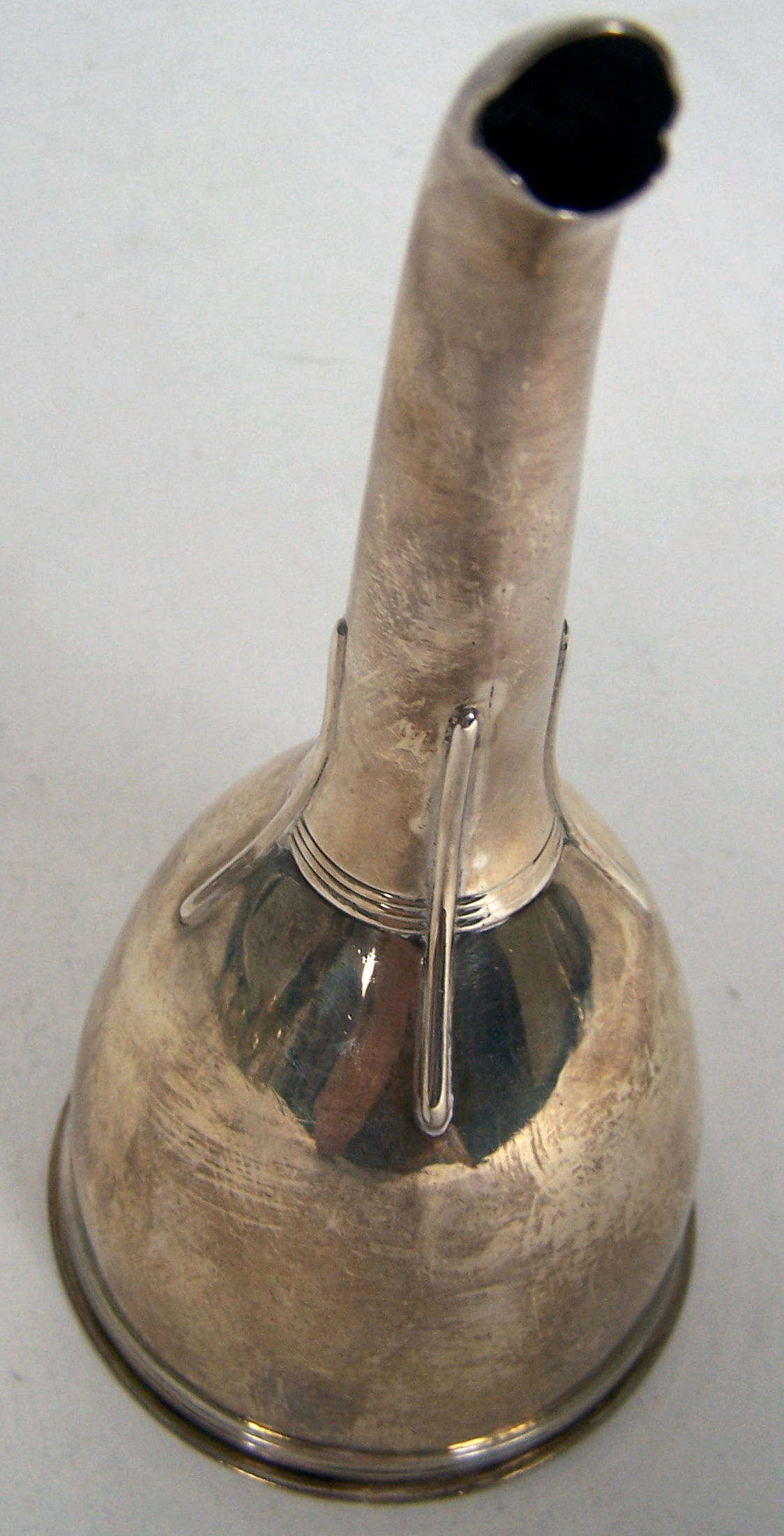 London 1800, maker's mark worn, the conical body with tapered spout with applied strengthening staves, the pull out strainer section with clip and muslin ring