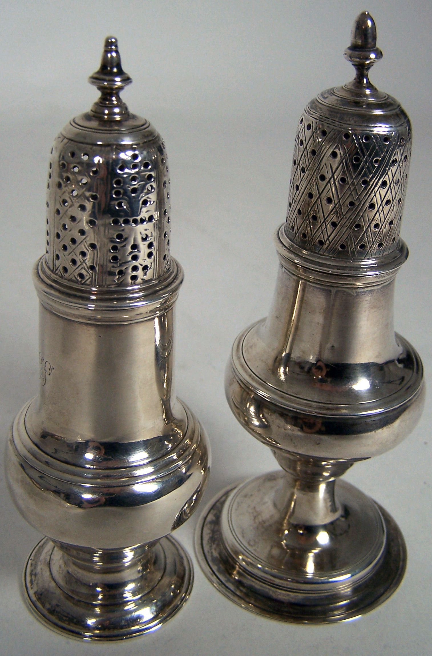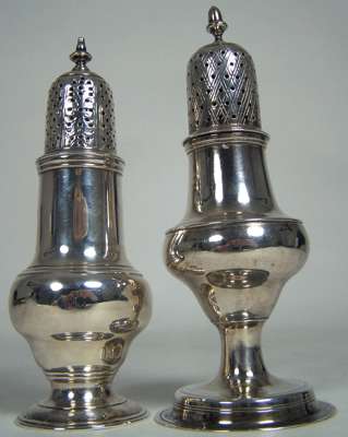 RP, London 1766, with baluster body with later engraved initials, on waisted stem and spool foot, the pull off domed cover with pierced and engraved cover with urn finial; together with a similar example London 1788, with baluster body and large spreading foot (2)