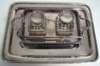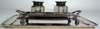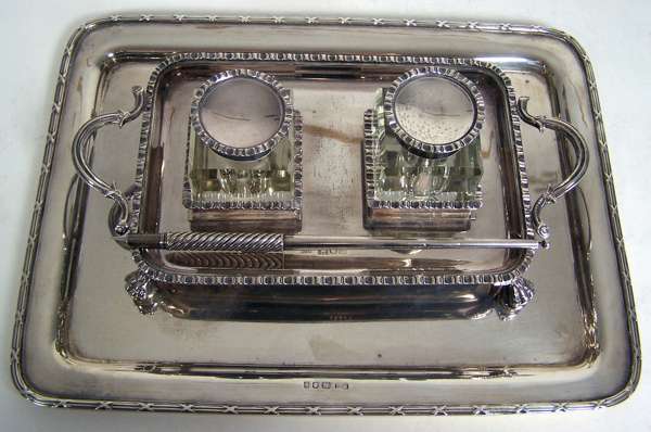 London 1899, the simple rounded rectangular tray with twin loop handles and raised on four claw and ball feet, set in two reeded collar mounts twin glass inkwells, with associated pen; together with a simple rectangular card tray 1925 (3)