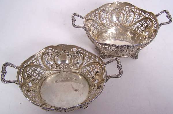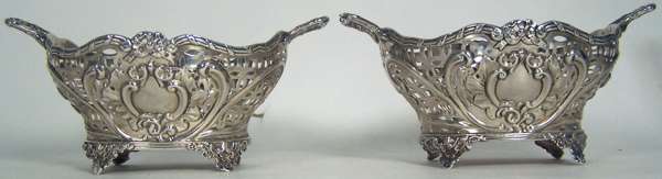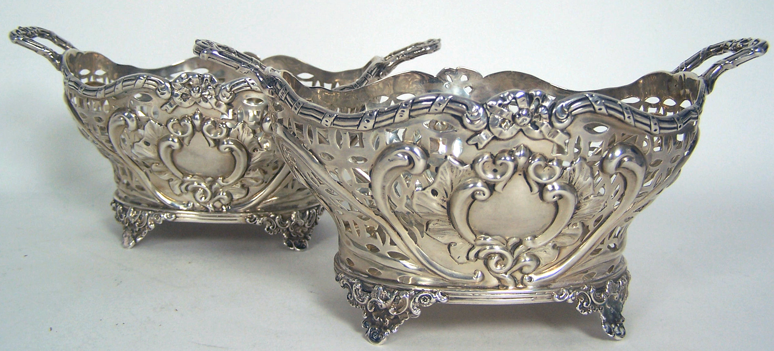 J Dixon & Sons, Sheffield 1900, of shaped outline with embossed scroll formed cartouches and pierced details, the reeded rim with ribboned details and similar loop handles, raised on foliate bracket feet (2)