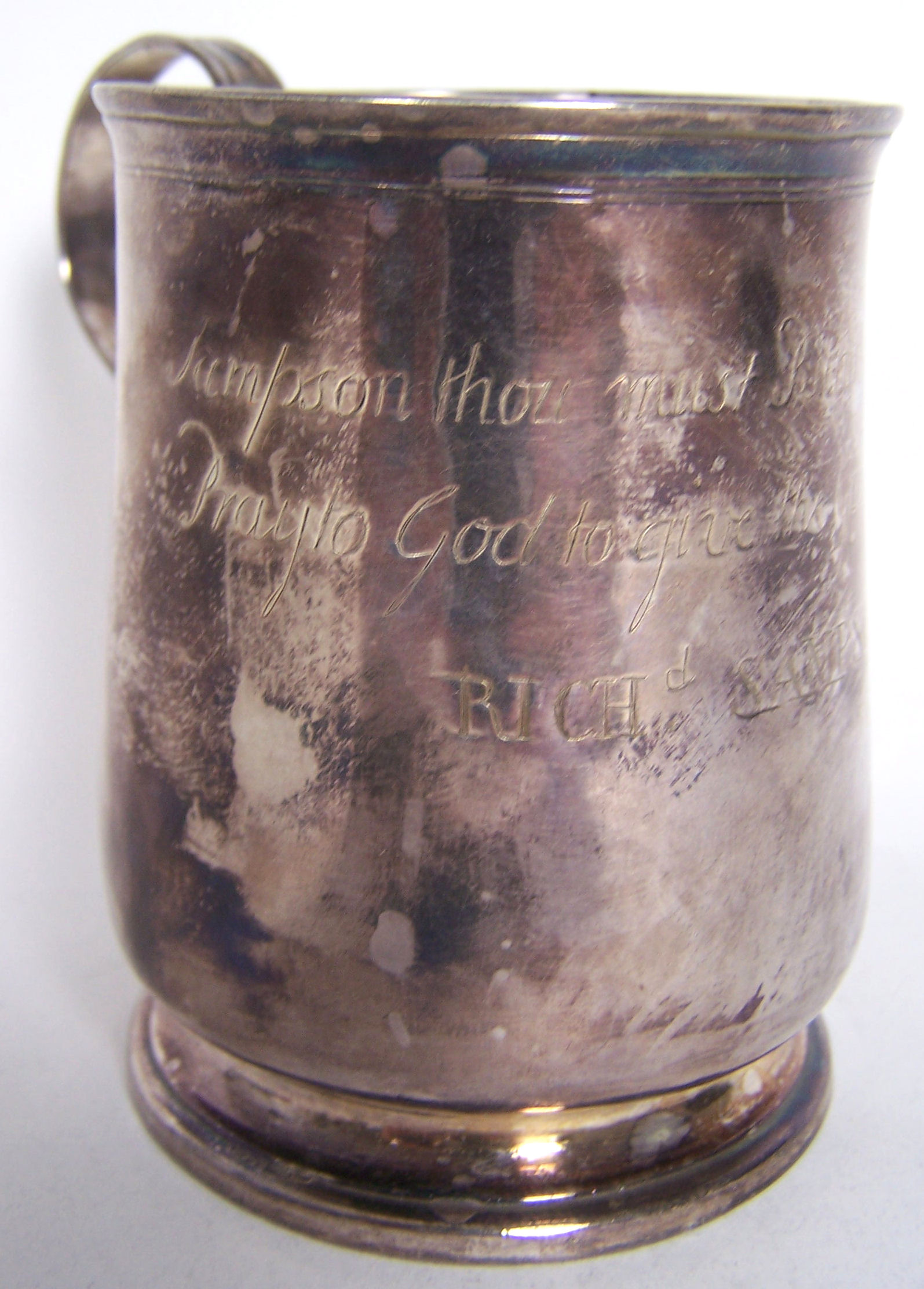 Newcastle 1734 (date letter struck twice), makers mark indistinct, of baluster form with reeded strap handle, the body engraved 'Sampson thou must run thy race, pray to God to give the grace, Richd Sampsons own cup'