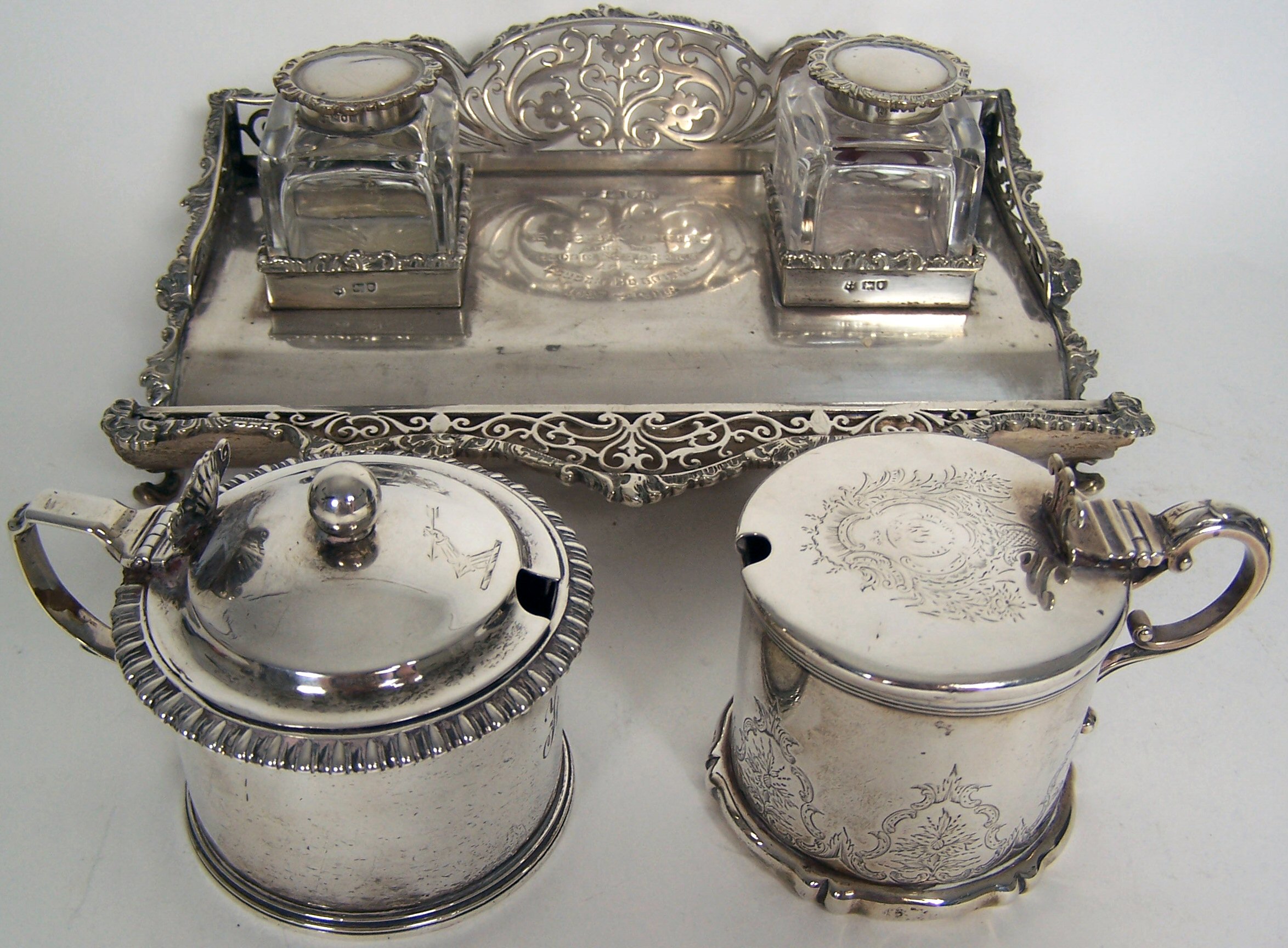 London 1819, makers mark double struck (WM?). simple plain sides on stepped foot, the rim with gadrooned details and domed hinged cover with bun finial; together with a Victorian example, London 1838, with chased lower border above a moulded serpentine foot, the hinged cover with chased cartouche and initials (2)