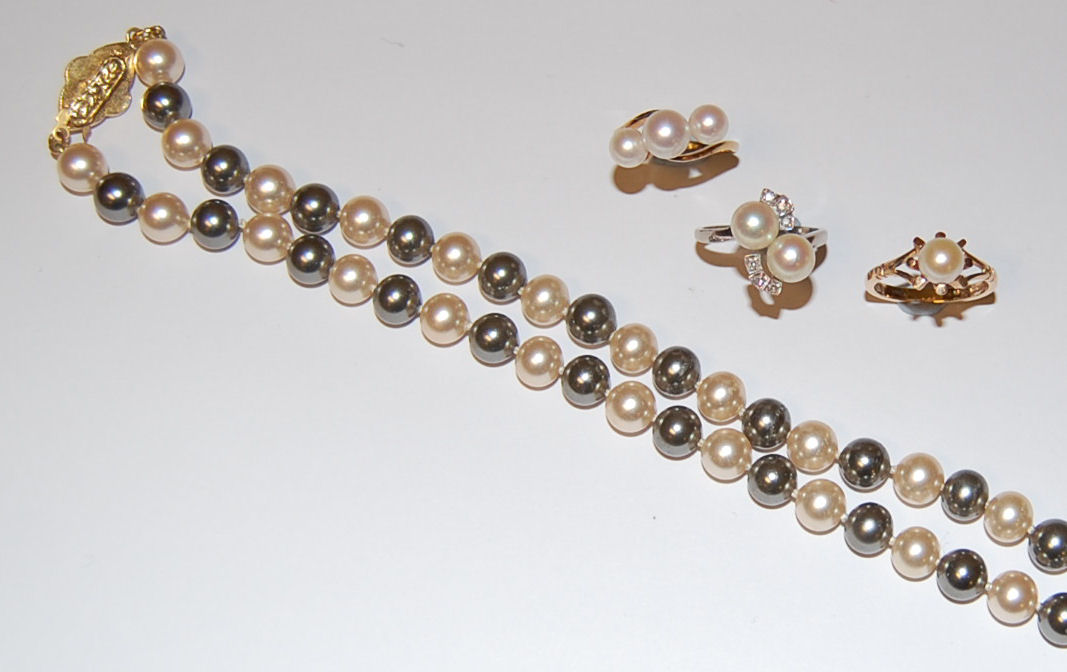 of cross-over set with two pearls, flanked by single cut diamond set scrolls; a Mikimoto cultured pearl set brooch, stamped K14; a seed pearl set cross form pendant, stamped 585; two cultured pearl set rings; two pairs of similarly set earrings; together with four bead necklaces (11)