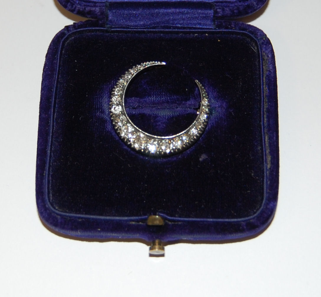 of closed crescent design, claw set with graduated old European cut diamonds, contained in a fitted case