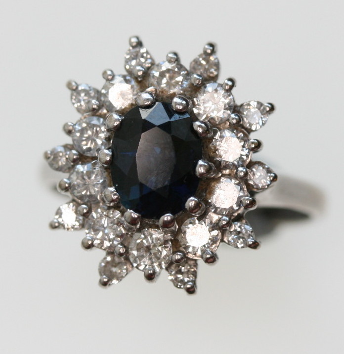 the oval sapphire with a surrounding inner border of ten circular cut diamonds and an outer border of ten small diamonds between, all set in white gold
