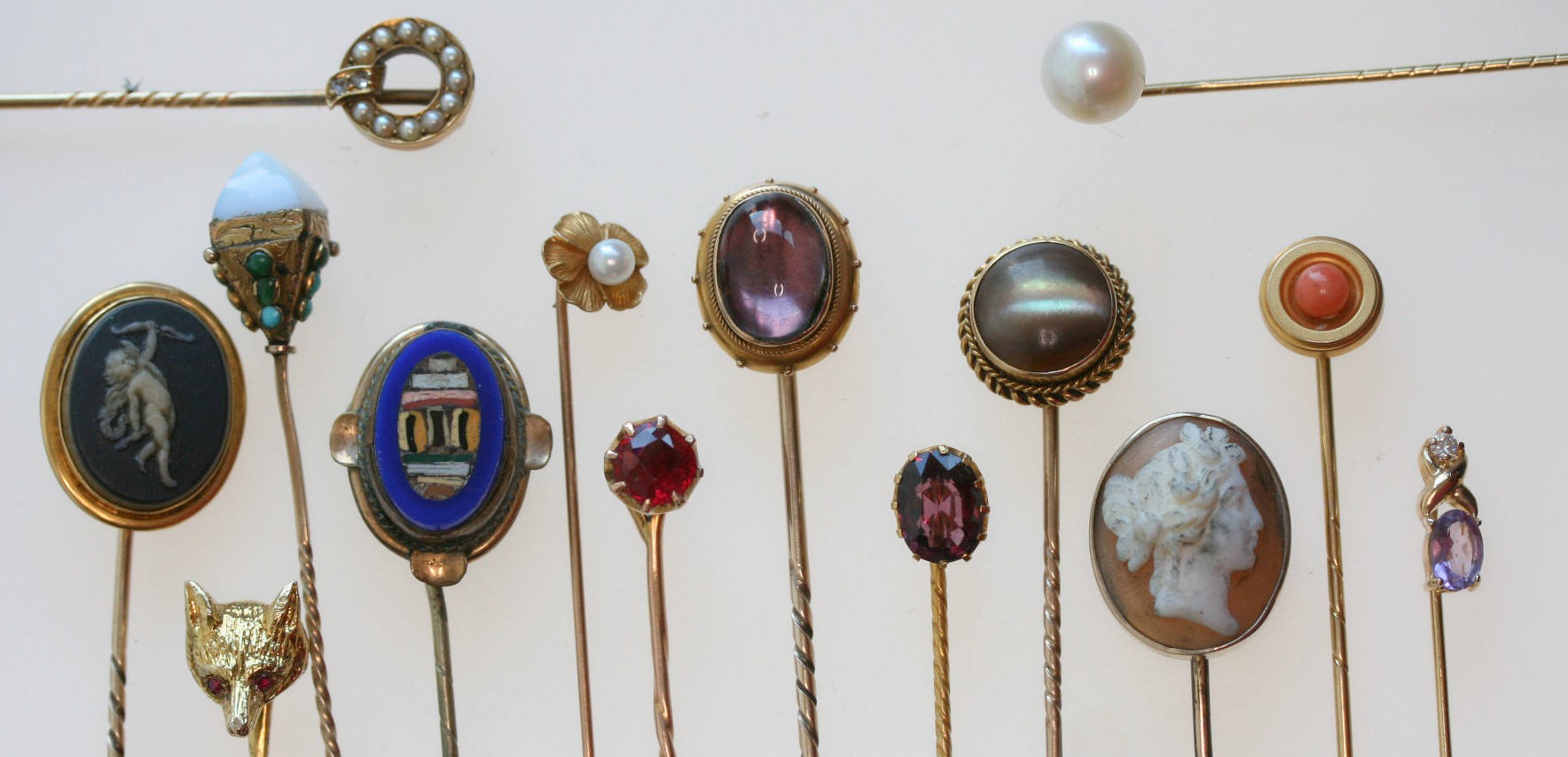 including examples with micromosaic; cameo; hardstone cameo; pearls; amethyst; coral; foxes head; etc. (14)