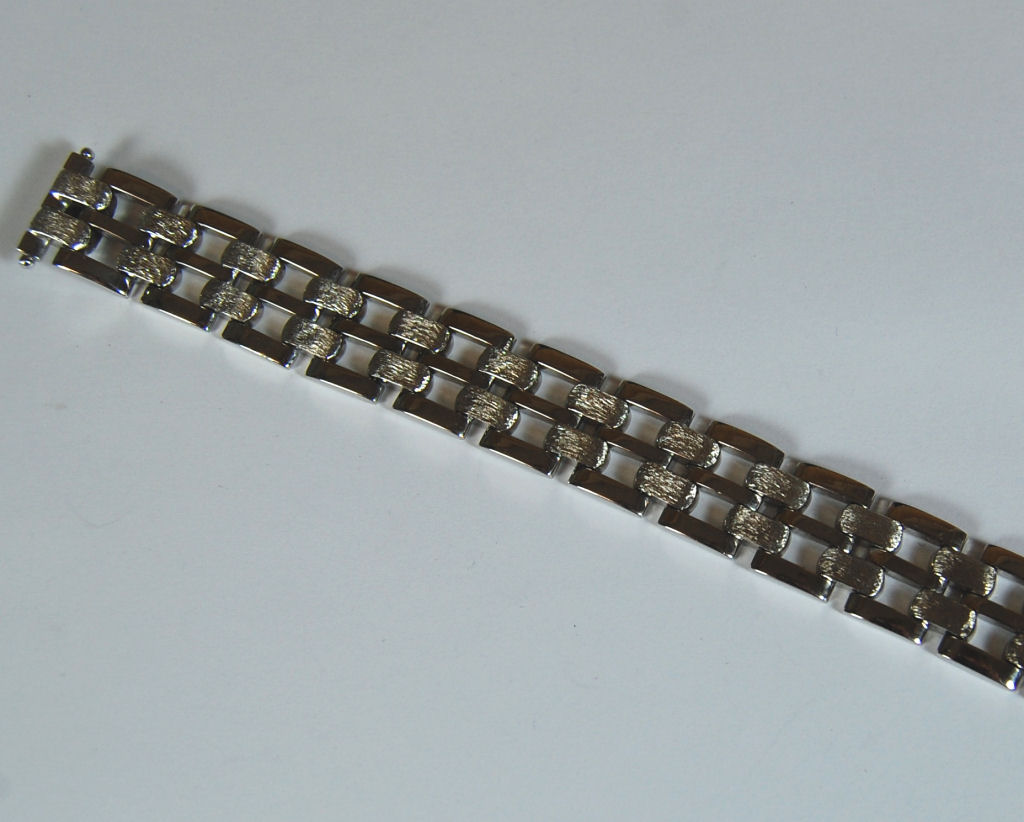composed of brick form links, some with textured finish, with concealed clasp and safety clips